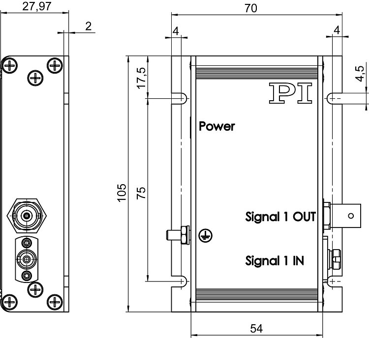 F-712.IRP1, F-712.IRP2 Optical power meter for 600 to 1700 nm wavelength range, 230 pW to 1.3 mW input power, 6 kHz signal bandwidth, 0.1 to 1.6 V logarithmic output