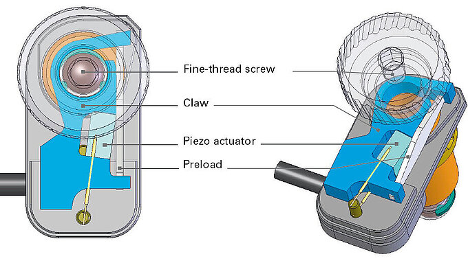 Compact, inexpensive inertia drive principle (stick-slip). At rest, the drive is self-locking, requires no current, and does not generate any heat. It holds the position with maximum force.