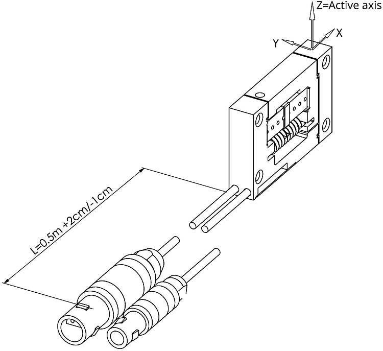 Inexpensive PiezoMove linear actuator; PICMA® piezo actuator drive; 500 µm travel range; SGS, indirect position measuring; LEMO connectors; 0.5 m cable length