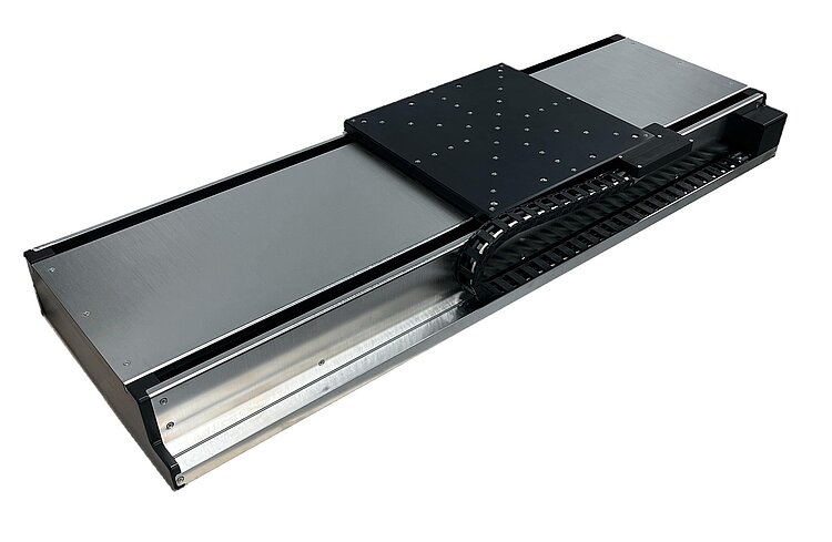 High-load precision linear stage with direct drive; ironless 3-phase linear motor; 750 mm travel range; 150 kg load capacity; 2000 mm/s maximum velocity; absolute linear encoder, 1 nm sensor resolution, BiSS-C, 32-bit; size of motion platform: 270 × 270 mm; model with lateral sealing