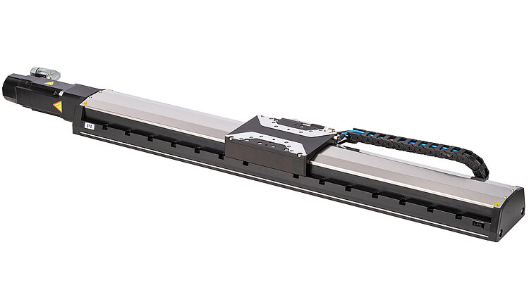High-load linear stage; synchronous servo motor to 320 V; 102 mm travel range; 400 N load capacity; 300 mm/s maximum velocity; ball screw; absolute rotary encoder, multiturn, 8192 counts/rev sensor resolution, EnDat 2.1; 116 mm width