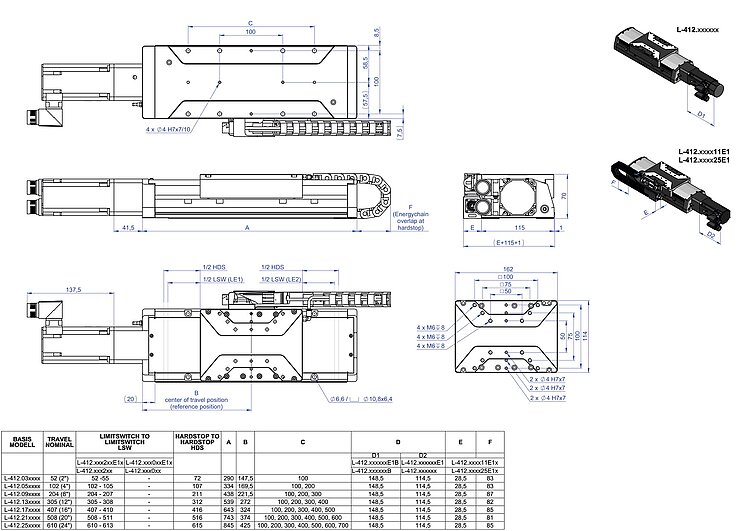 - Versions with linear encoder with drag chain and connection box (L-412.xxxxxxE1).