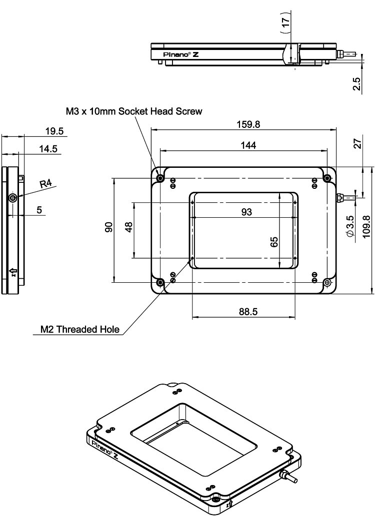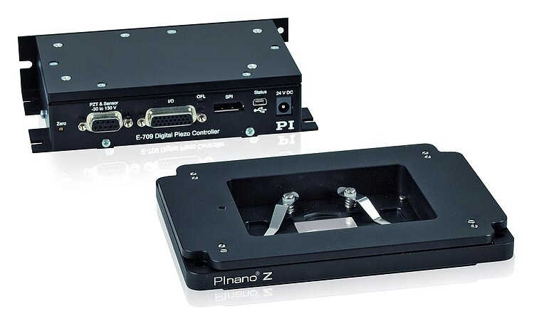 PInano® Z piezo scanner system; 100 µm travel range; clear aperture for microscope slides; piezoresistive sensors; with USB digital controller