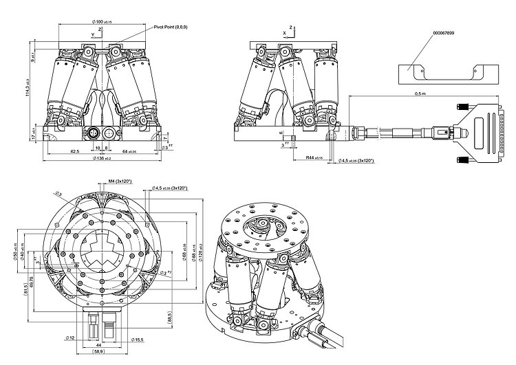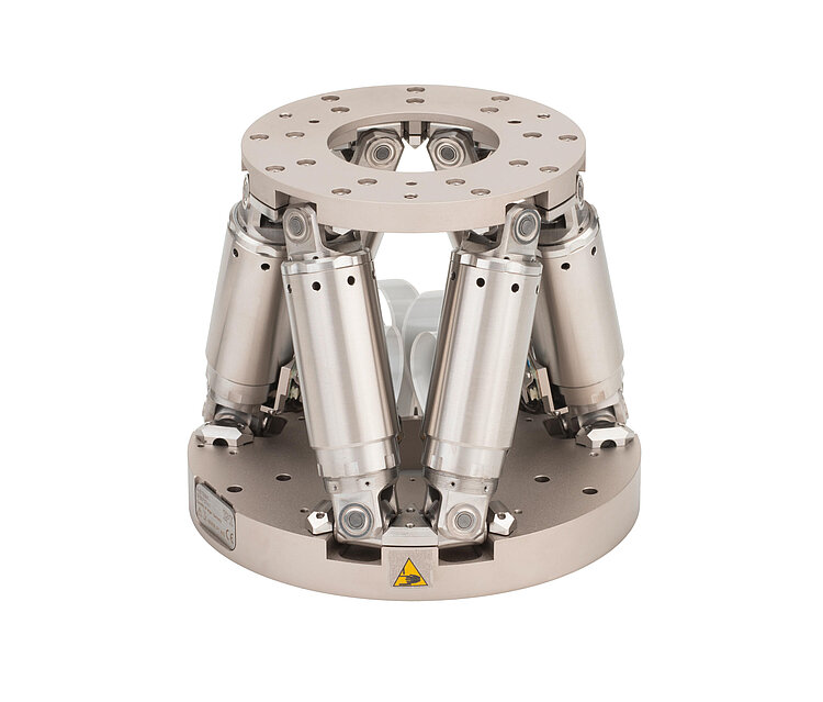 Miniature hexapod for highly dynamic applications; BLDC motor; 2.5 kg payload; 25 mm/s maximum velocity; 0.5 m cable length. Connecting cables are not included in the scope of delivery and must be ordered separately.