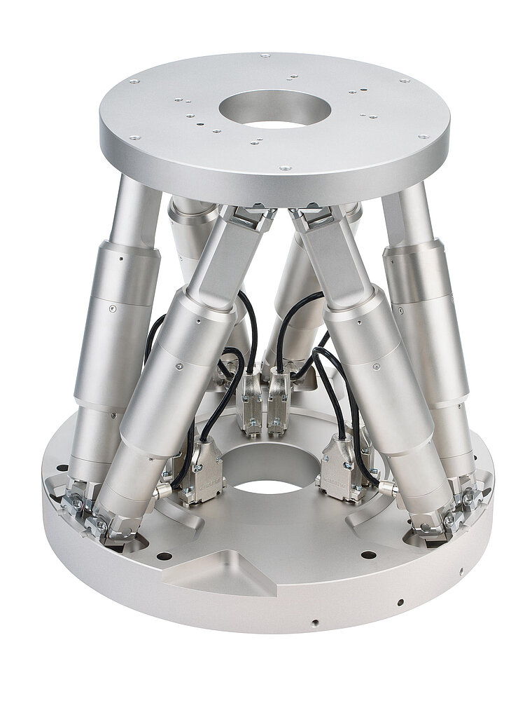 The parallel-kinematic design for 6 degrees of freedom makes it significantly more compact and stiffer than comparable serial kinematic systems. The advantages over serial, i.e., stacked systems, are mainly the much better path accuracy and repeatability. In addition, the moved mass is lower and allows improved dynamics which is the same for all motion axes. Cable management is not a problem because cables are not moved.
