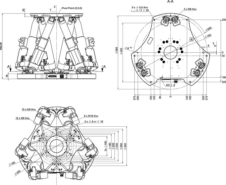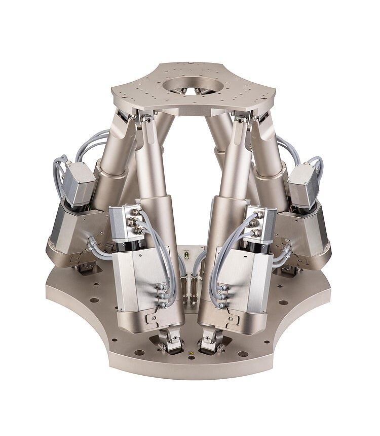 Parallel-kinematic design for six degrees of freedom making it significantly more compact and stiff than serial-kinematic systems, higher dynamic range, no moved cables: Higher reliability, reduced friction.