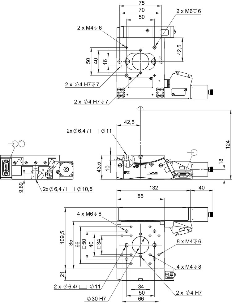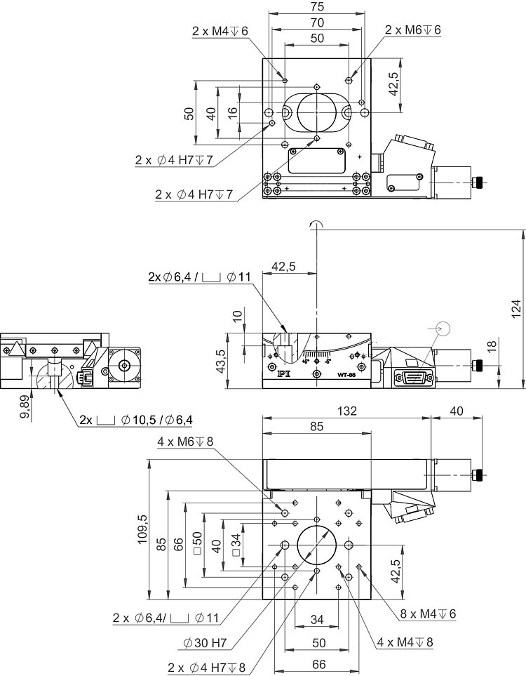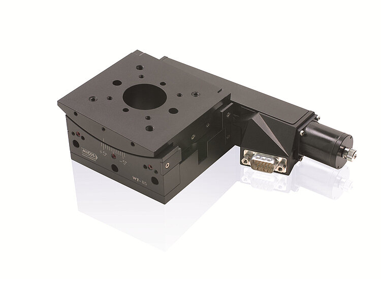 WT-85 goniometer stage, 85 mm width, DC motor, ±5° rotation range, angle measuring system with A/B quadrature signal transmission, clear aperture 30 mm diameter, mechanical limit switches