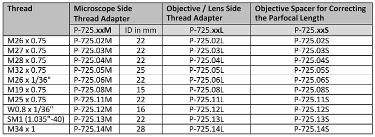 Thread Adapters for P-725.xCDE2 PIFOC Focus Scanners and P-725.xCDE1S PIFOC Scanner Systems